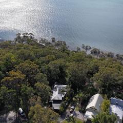 The open-plan kitchen and living area flow to a private deck surrounded by native greenery, capturing sea breezes and the sound of the lapping water.